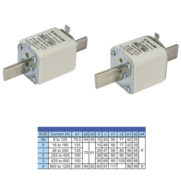 Corpo cerâmico de alta resistência DIN 43620 e 57636. Baixas perdas. Partes metálicas à prova de corrosão. Capacidade de ruptura 120 kA; com 500 Vac. Características gG e aM.
